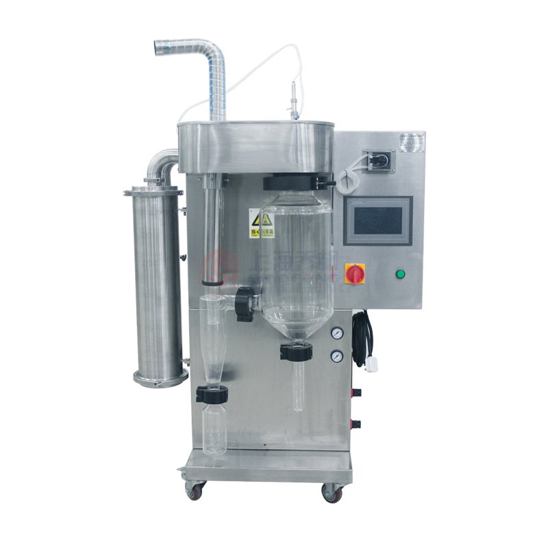 小型噴霧干燥機8000S加布袋型 定制款(噴霧干燥儀/噴霧干燥機)及其主要適用于高校、研究所和食品醫藥化工企業實驗室生產微量顆粒粉末,對所有溶液如乳濁液、懸浮液具有廣譜適用性, 適用于對熱敏感性物的干燥如生物制品、生物農藥、酶制劑等,因所噴出的物料只是在噴成霧狀大小顆粒時才受到高溫,故只是瞬間受熱,能保持這些活性材料在干燥后仍維持其活性成份不受破壞。